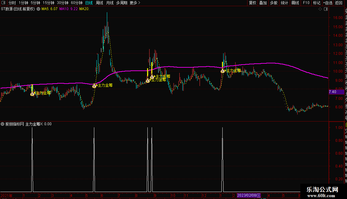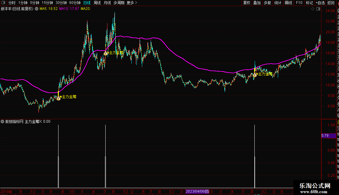 1. 主图公式:导入通达信主图指标后,金筹线(COLORFF00FF)为核心参考位,当个股均线呈多头排列(MA10>MA20>MA60),且股价涨停突破金筹线时,出现的彩色涨停柱和星星提示为买入信号;