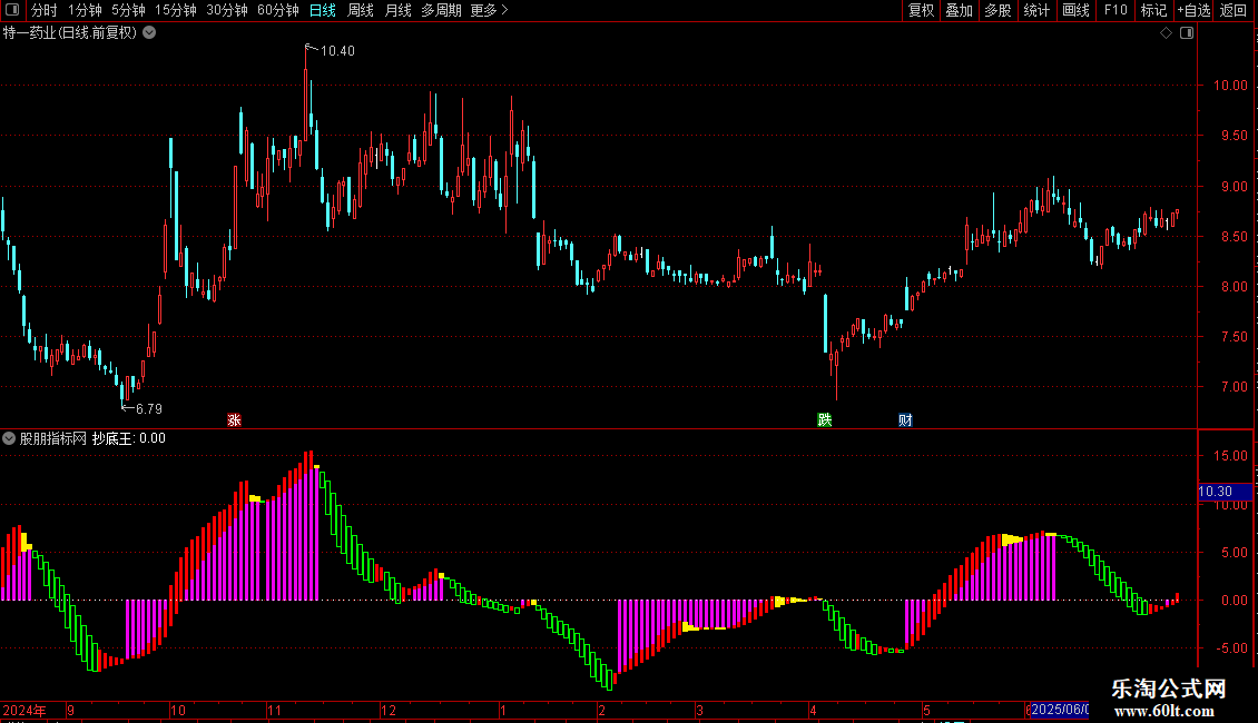 指标通过多组均线、价格偏离度及成交量分析,识别趋势状态与底部信号。主图以柱状线区分“持股”、“持币”、“反转”、“洗盘”四种状态,并设有“抄底王”文字标记,提示潜在底部反弹机会。适用于中短线趋势跟踪与超跌反弹捕捉。