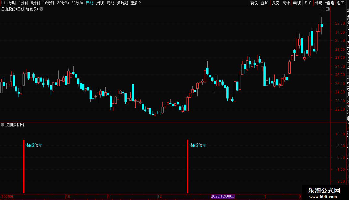 1. 副图版:出现蓝色柱体+黄色“强龙信号”,代表个股短期强势启动;出现紫色柱体+粉色“★双轨擒龙”,为核心买入信号;