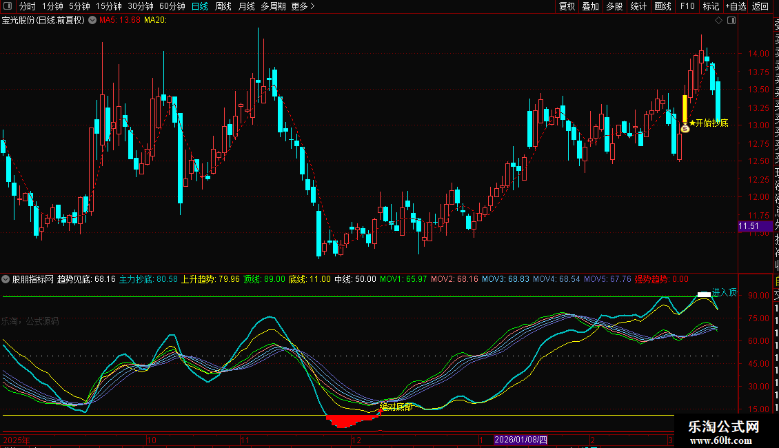 1. **主图指标**:以5日均线为基础,结合EMA均线差值和价格震荡因子(DD),满足多条件共振时,会在K线标注黄色柱体、“★开始抄底”文字及买入图标,直观提示抄底信号。