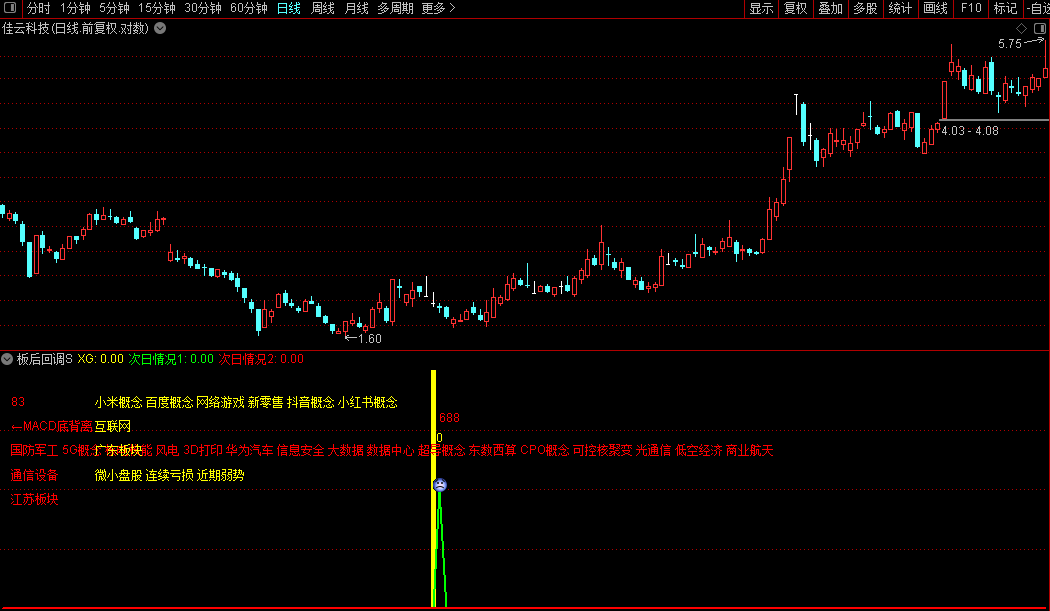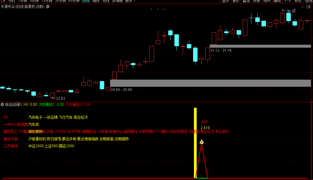 2.指标用法:今买明卖操作。尾盘买入,第二天冲高出局,不拿到收盘,这样的话,相对安全。使用【板后回调S】升级版可在收盘前5-10分钟左右使用选股器选股,选出当天出现的信号,然后打开相应个股查看【板后回调S】升级版指标的副图,若果您也看好该股,临近收盘前3-5分钟副图信号不消失可介入。第二天盘中冲高就出,不必等到收盘。
