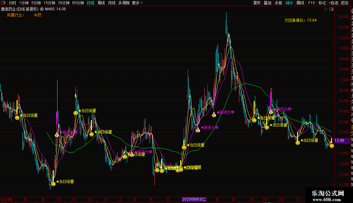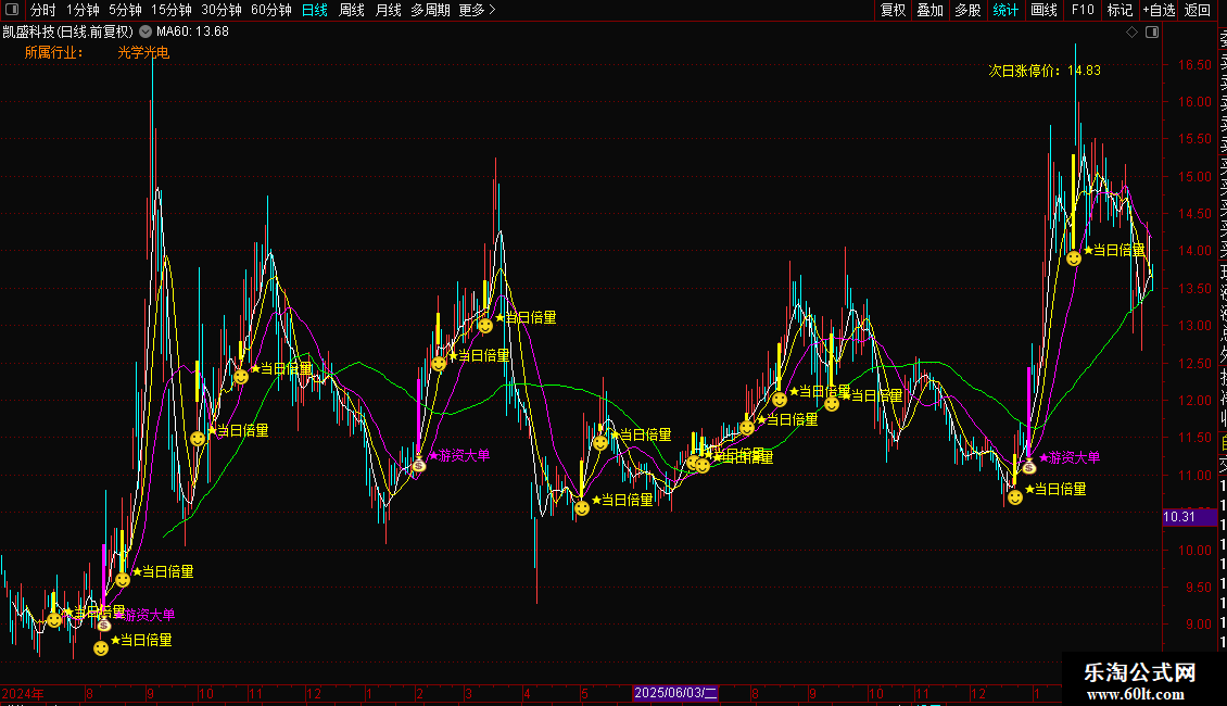 指标主要功能是辅助短线交易,实时显示个股所属板块及次日理论涨停价,帮助投资者预判空间。核心策略是通过均线系统和特殊算法,识别“倍量阳线”与“游资大单”进场信号:当出现黄色柱体提示当日倍量时,关注主力建仓迹象;若出现紫色柱体并标注“游资大单”,则意味着资金强势介入且形态突破,是更明确的短线追涨买点。
