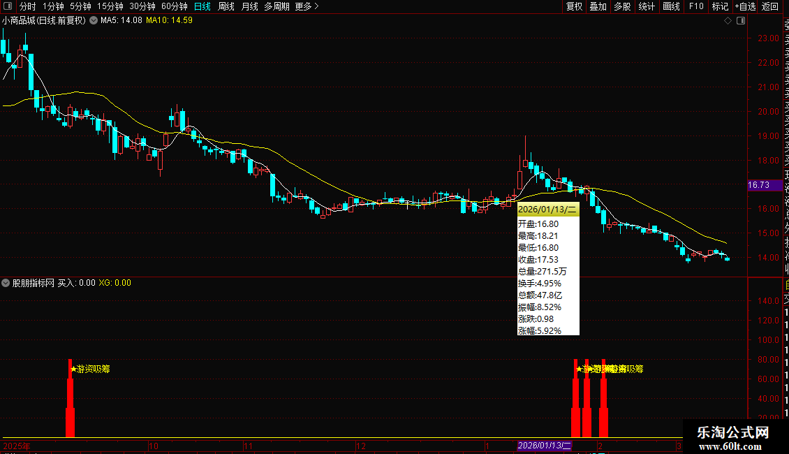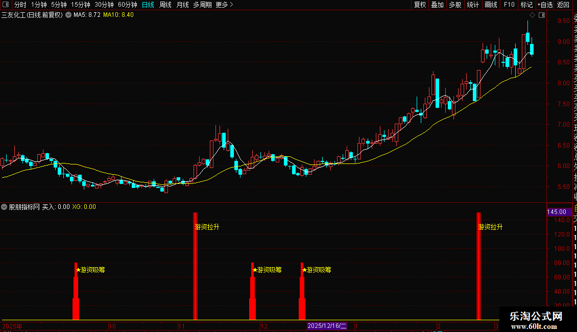 4. 游资低位吸筹布局确认后,主图幅图出现游资拉升共振信号,代表进入连板加速行情