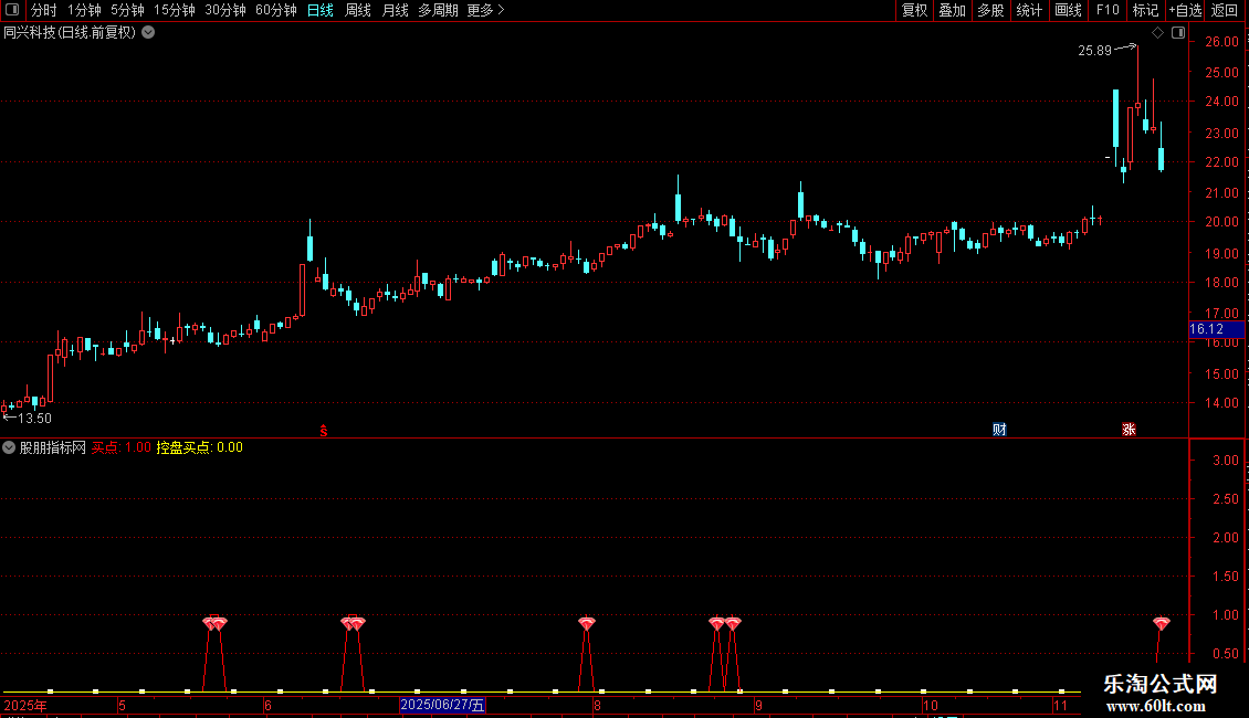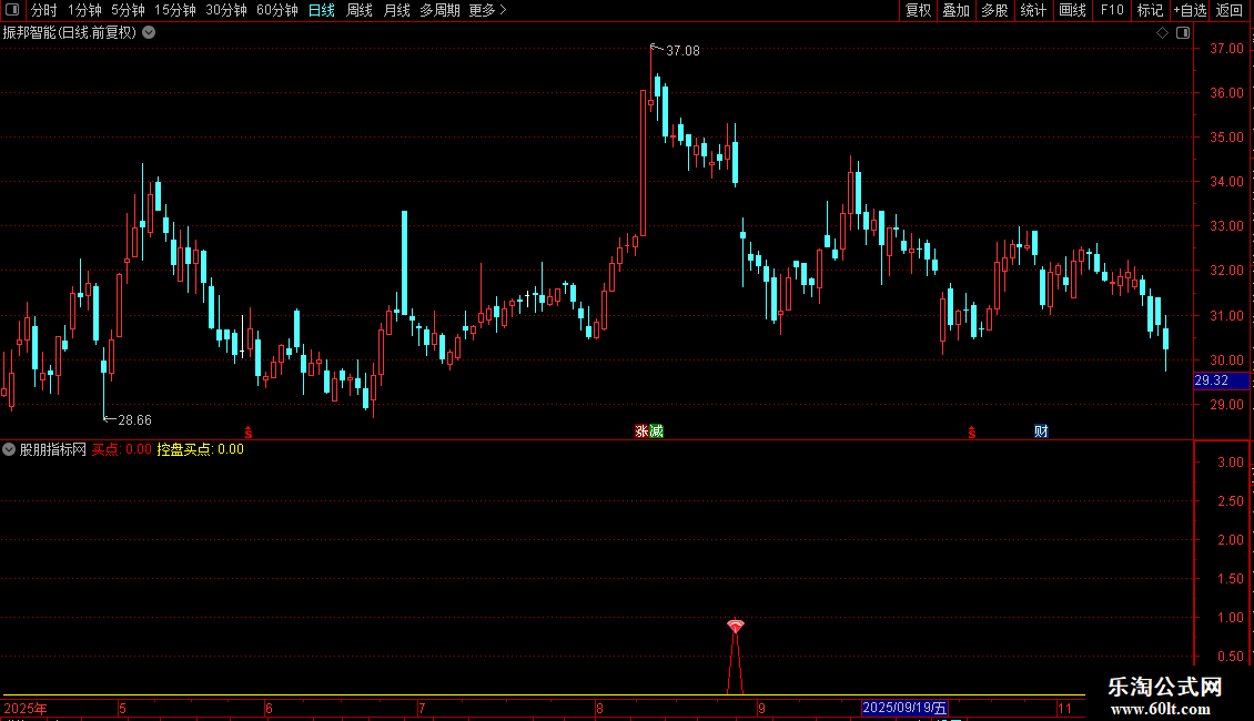 2. 控盘买点:在基础买点出现后,进一步要求资金呈现“有庄控盘”的流入状态,并且股价上穿短期趋势线。这是更强烈的买入信号,会在副图以特殊的蓝色柱状和黄色文字标注。