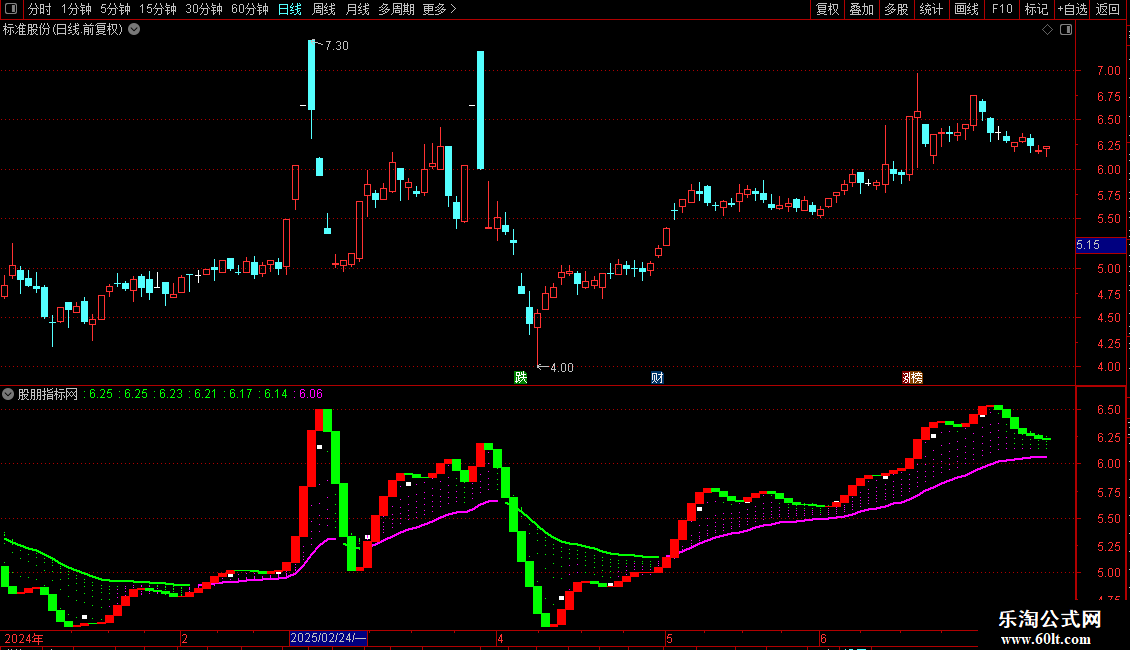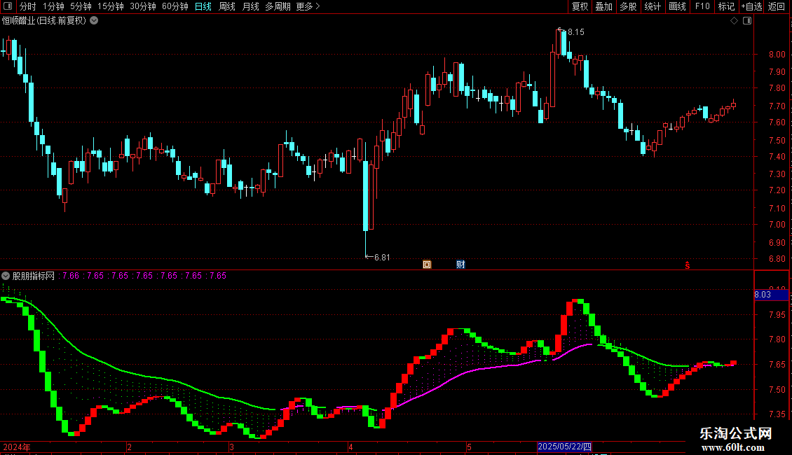 它通过计算七组不同周期的指数移动平均线,并对其未来值进行预测,形成多条趋势线。当预测线上涨时,以洋红色点状线显示;下跌时,以绿色点状线显示。其中最长周期的VAR7线加粗显示,使其更醒目。