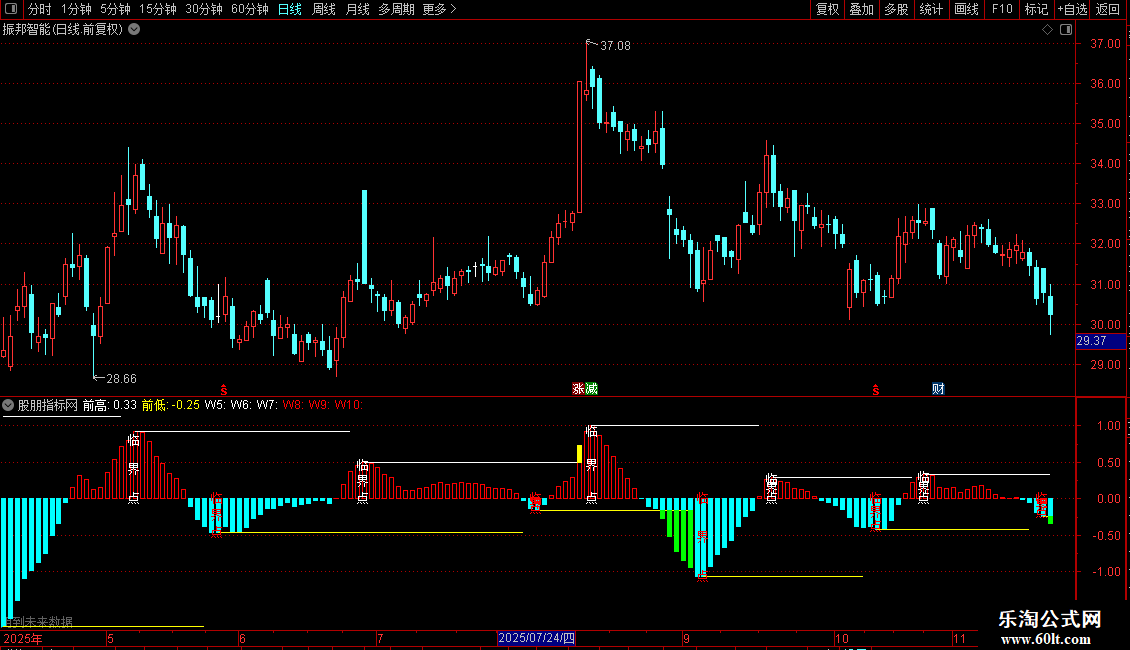 观察MACD柱状线与“前高”、“前低”趋势线的相对位置。当红色柱体突破白色“前高”线时,可能预示上涨动能增强;当青色柱体跌破黄色“前低”线时,可能预示下跌动能加强。同时关注“临”、“界”、“点”的文字提示位置,它们标识了潜在的阻力或支撑临界区域。