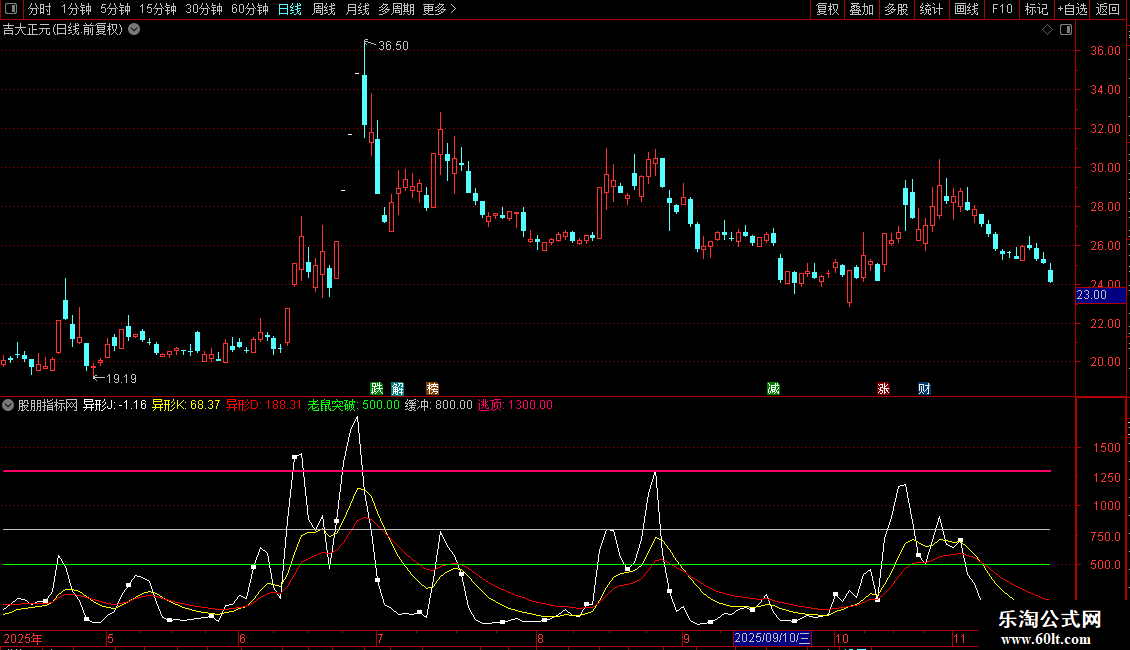 指标结合了筹码分布、KDJ及价格区间,通过异形J、K、D三条线进行动态分析。异形J线为核心波动线,异形K线为短期趋势线,异形D线为长期趋势线。老鼠突破、缓冲、逃顶为三条水平参考线,用于识别关键突破位与风险区域。指标旨在捕捉价格在筹码与动能共同作用下的趋势转折点。