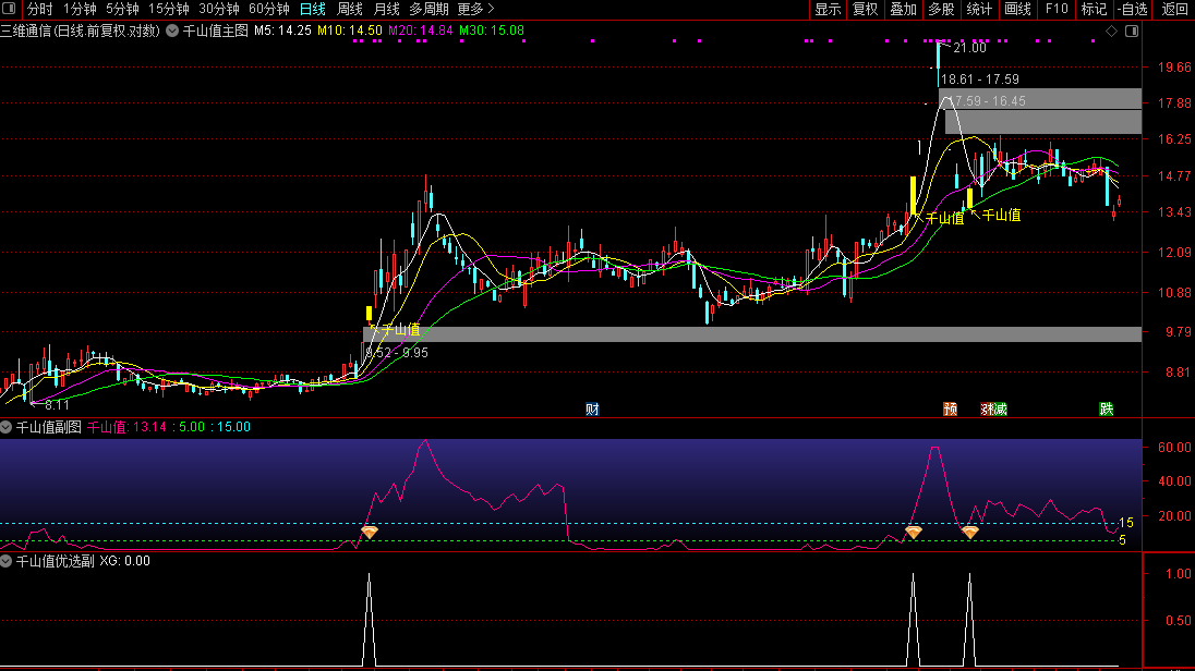 买入信号:在日线图中,如果股价刚向上突破不久,而“千山值”已突破400并稳定站在400上方,这是大牛股的共同特征,此时可积极跟进。