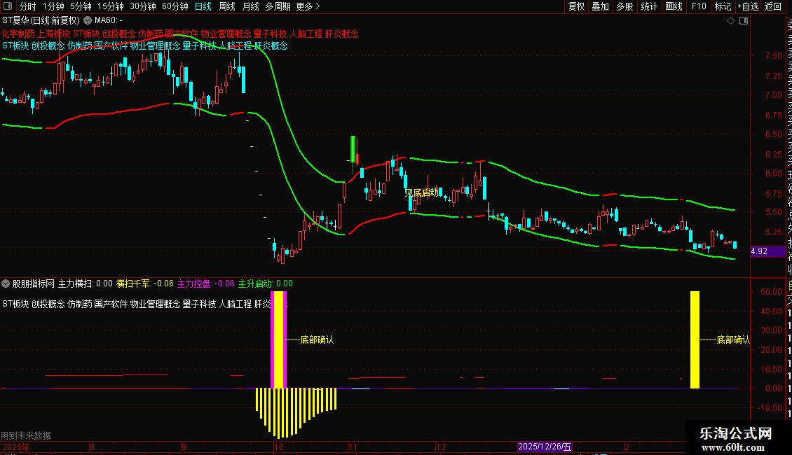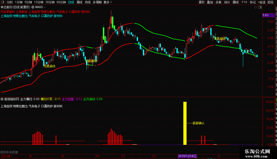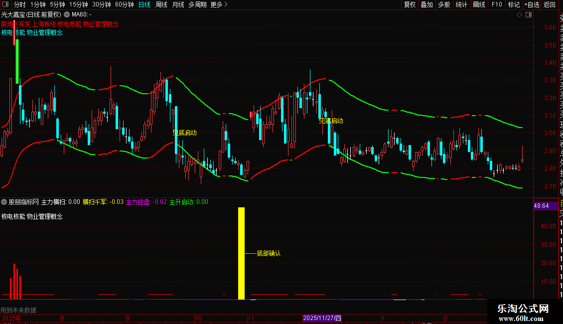 主图指标标注板块信息、支撑压力线,用彩色K线高亮强势/弱势异动,出现“见底启动”提示代表主力低位蓄力;