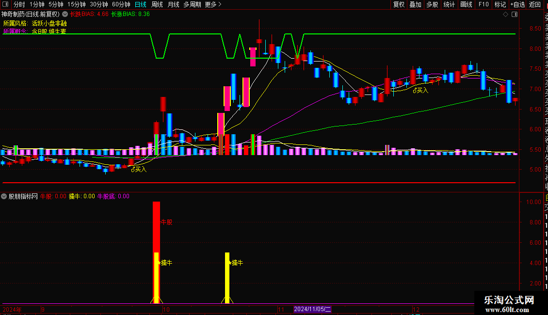 短涨BIAS:=IF(BIAS11>=6,天,天+0.6),COLORBLACK,LINETHICK2;