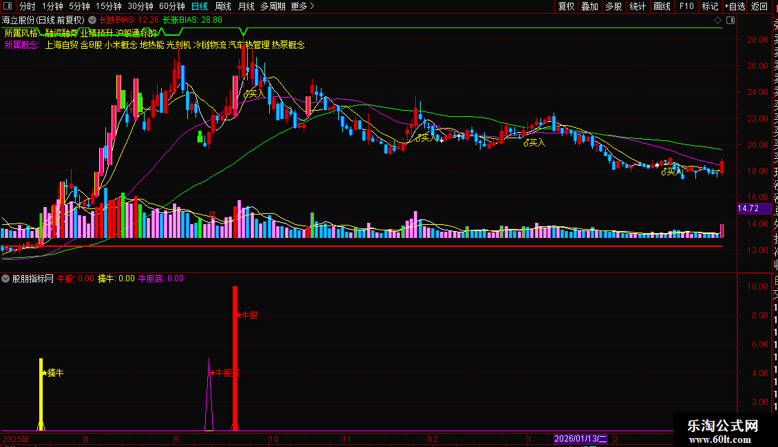 长跌BIAS:IF(BIAS13<=-16,0.6+地,地),COLORRED,LINETHICK2;