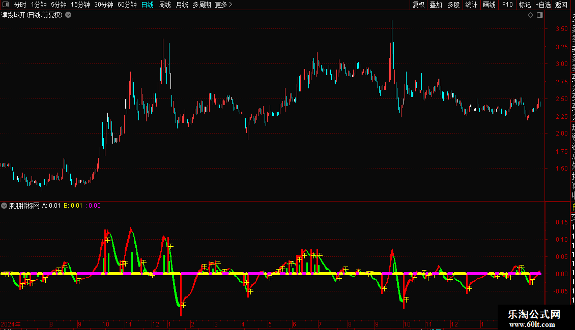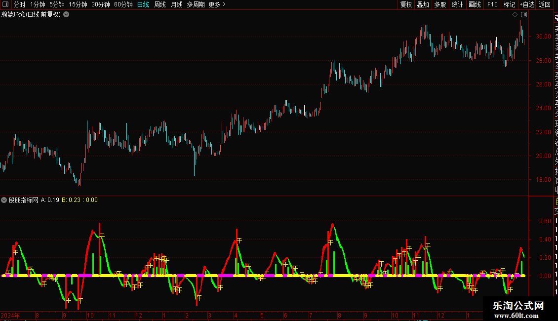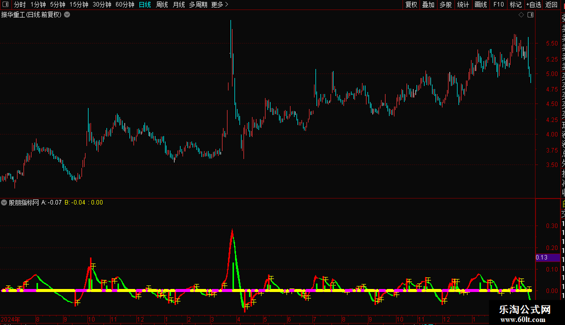 指标通过两条不同周期的指数均线差值构建动能带,直观展示多空力量变化。红色区域代表多头强势,绿色区域代表空头主导。操作策略上,当动能线由弱转强并出现“干”字信号时,视为买入时机;反之,当动能线由强转弱时,则为卖出或减仓信号。粗线条颜色变化辅助判断趋势延续性,紫色代表上涨加速,青色代表下跌加速。