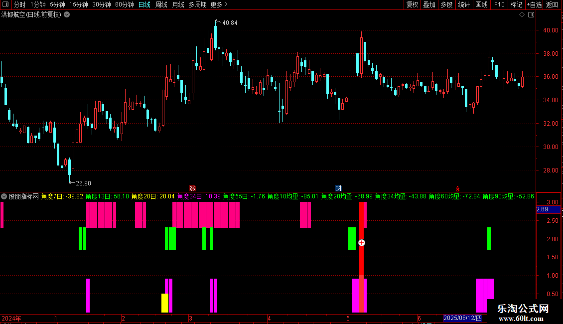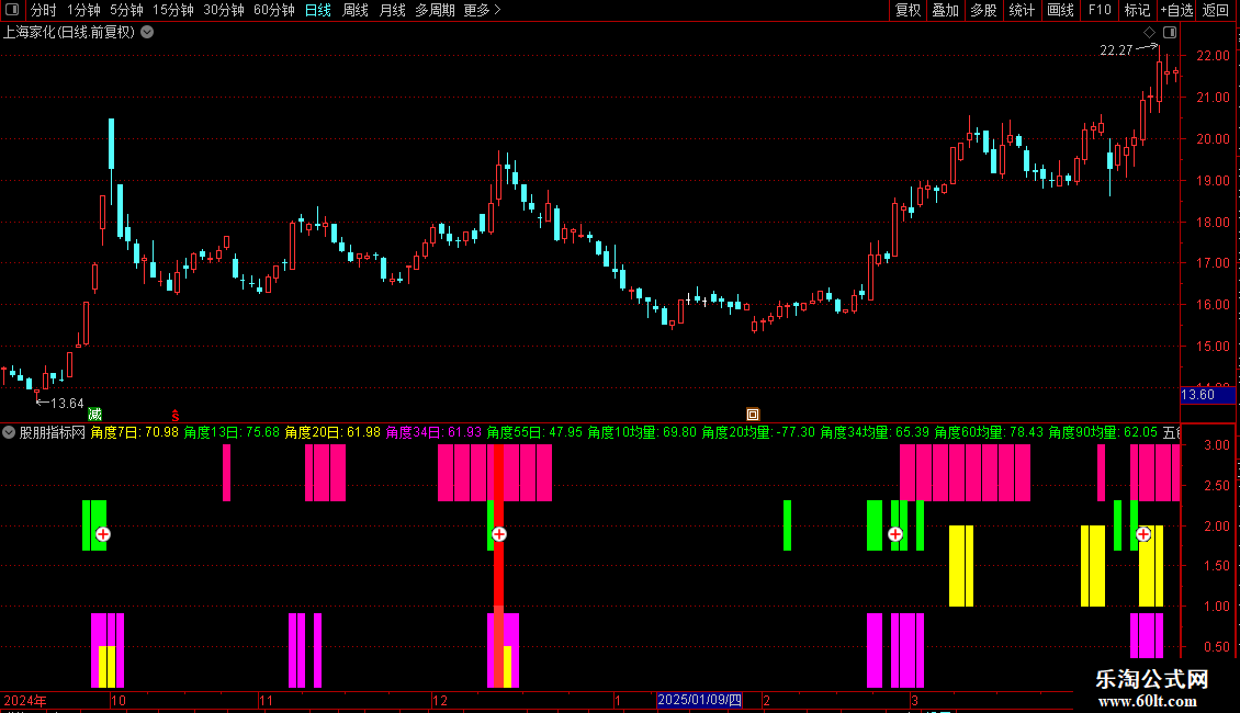 角度60日均量:=ATAN((V60/REF(V60,3)-1)*100)*180/3.1416 ;