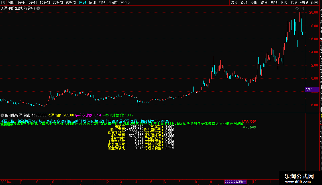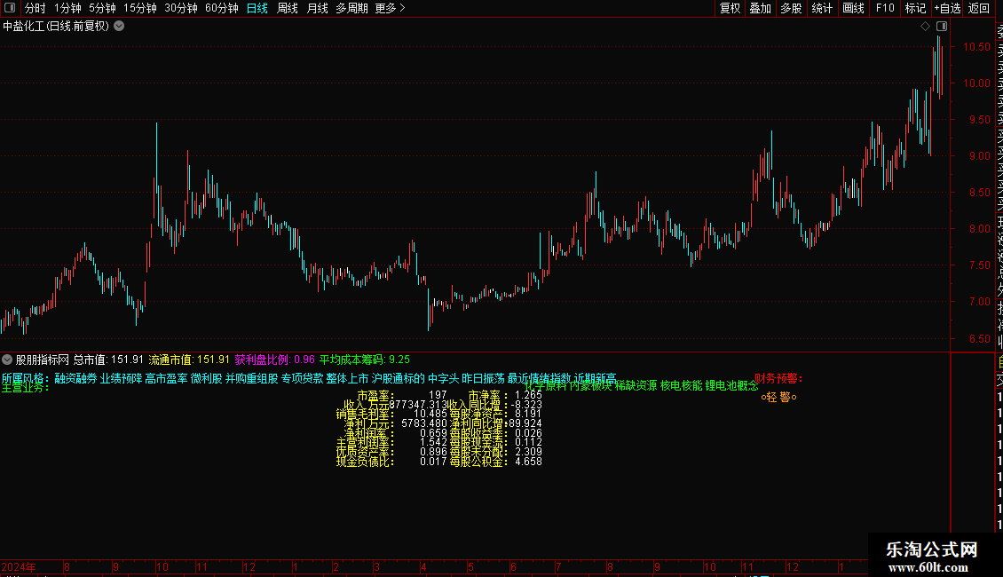 指标是一个全面的基本面信息面板,直接在K线图上展示个股的所属板块、主营业务、市值规模及获利盘比例。核心功能是进行财务健康度诊断,通过计算Z值模型自动预警财务风险(重警、轻警或无警)。同时,它详细列出了市盈率、毛利率、净利润增长率、每股现金流等关键估值与成长指标。操作策略上,投资者可利用此面板快速筛选低估值、高成长且财务安全的标的,避开有财务预警的风险股,辅助价值投资决策。