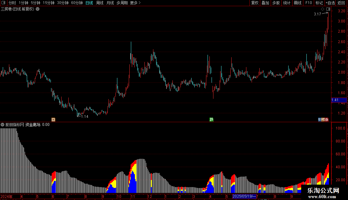指标在副图区域显示彩色柱状图。出现三色柱时,表示长、中、短线资金同步流入,是看多信号。当柱状图消失或出现“资金离场”标识时,表明资金流入状态被破坏,需警惕趋势变化。