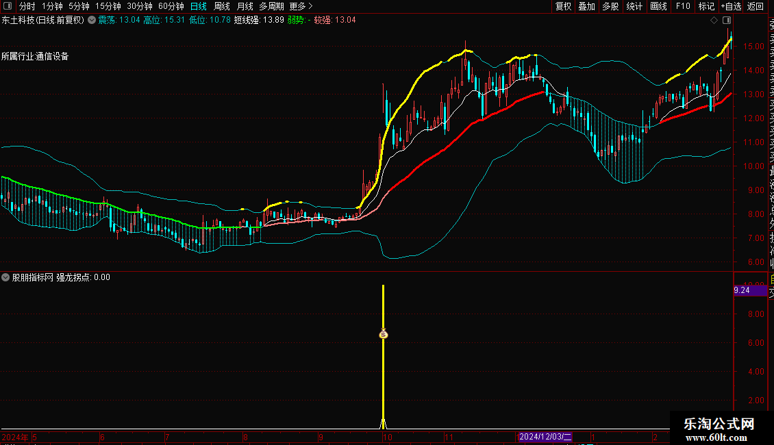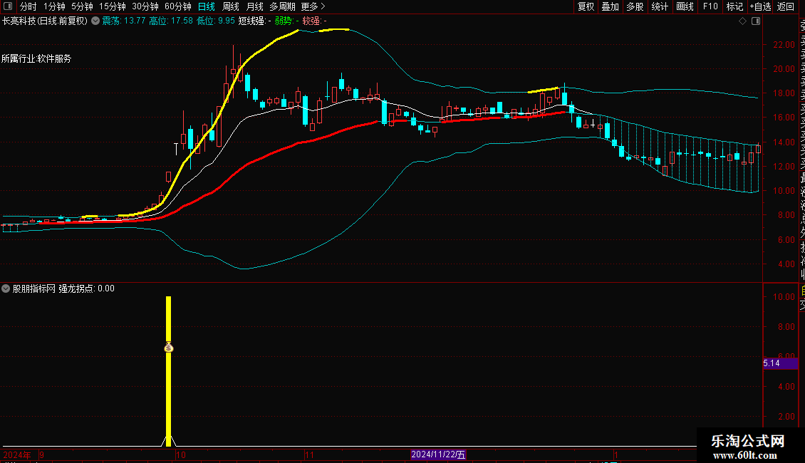 信号介入: 当副图出现黄色柱状线或图标(强龙拐点)时,代表系统捕捉到了“连阳+涨停”的爆发形态。这通常被视为短线加速的信号,可结合成交量变化考虑跟进。