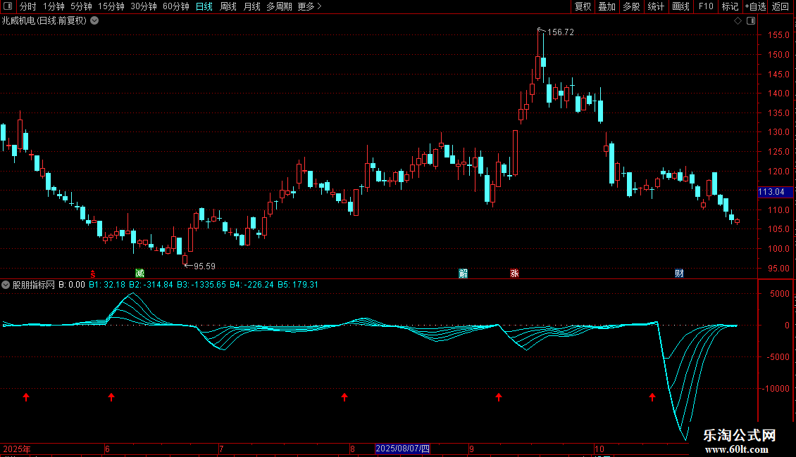 指标包含能量线B1至B5,以及基于能量线形态和强度的筛选条件。信号以图标形式在副图显示。