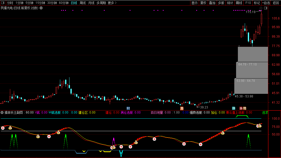 洋红色“满仓”信号(数值38):均线多头排列,股价突破,是加仓或重仓点。