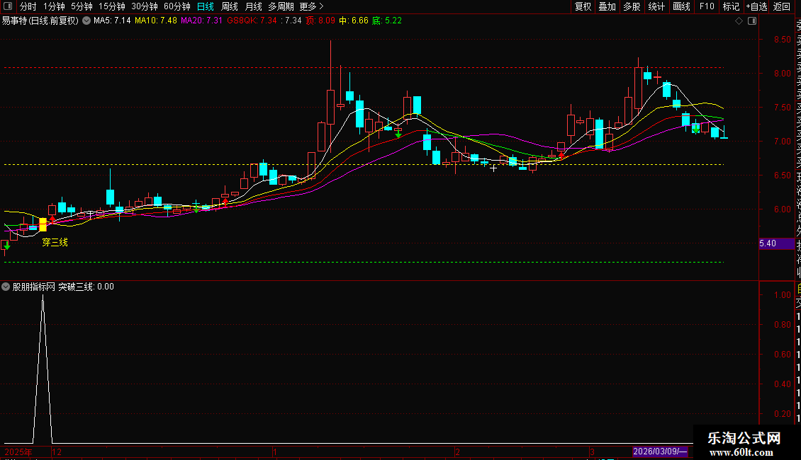突破三线:O < MIN(MA5,MIN(MA10,MA20)) AND C > MAX(MA5,MAX(MA10,MA20));