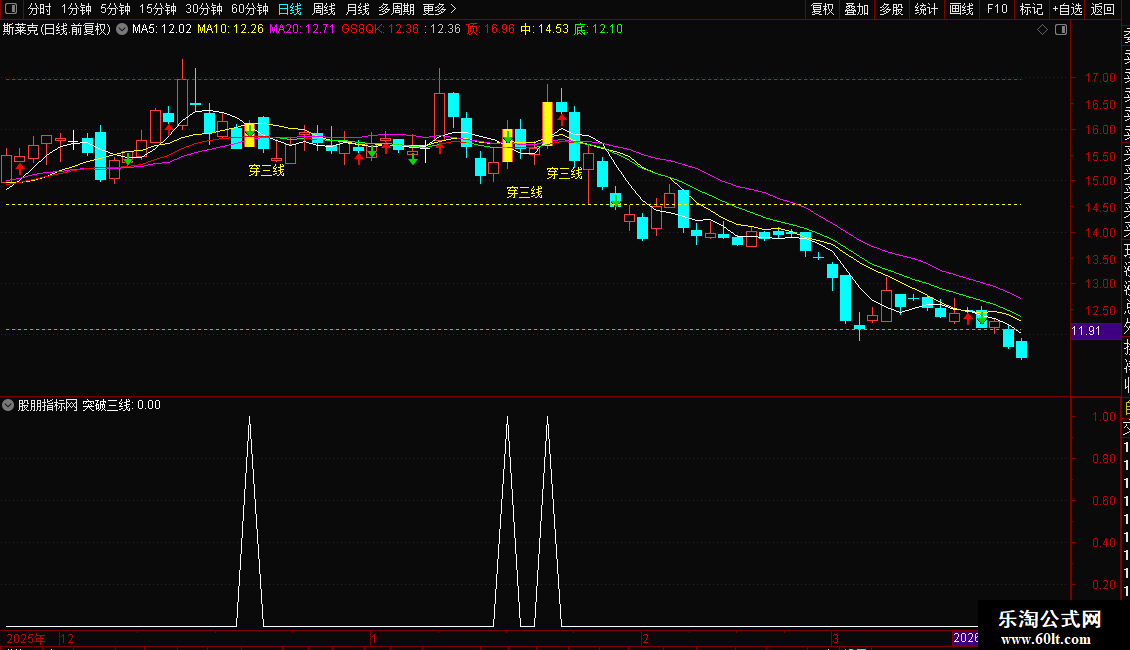 DRAWTEXT(突破三线, L*0.97, '穿三线'),COLORYELLOW;