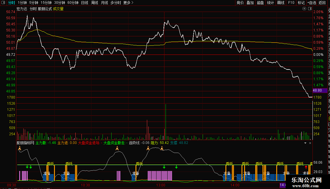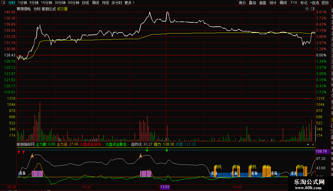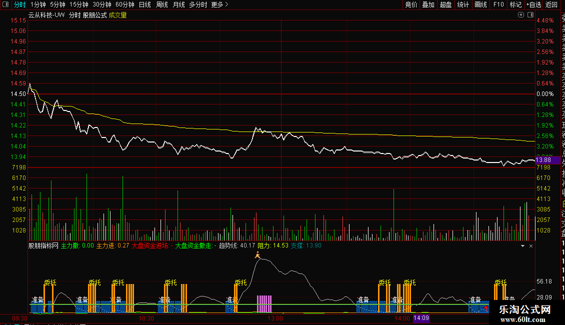 加载至副图。观察“主力进/撤”与“大盘资金”柱状图的颜色与高度,判断资金合力方向。结合“趋势线”的数值、拐点以及“准备”、“委托”、“见顶清仓”等文字和图标信号,辅助判断个股的阶段性买卖时机。同时可参考指标自动计算的支撑位与阻力位。