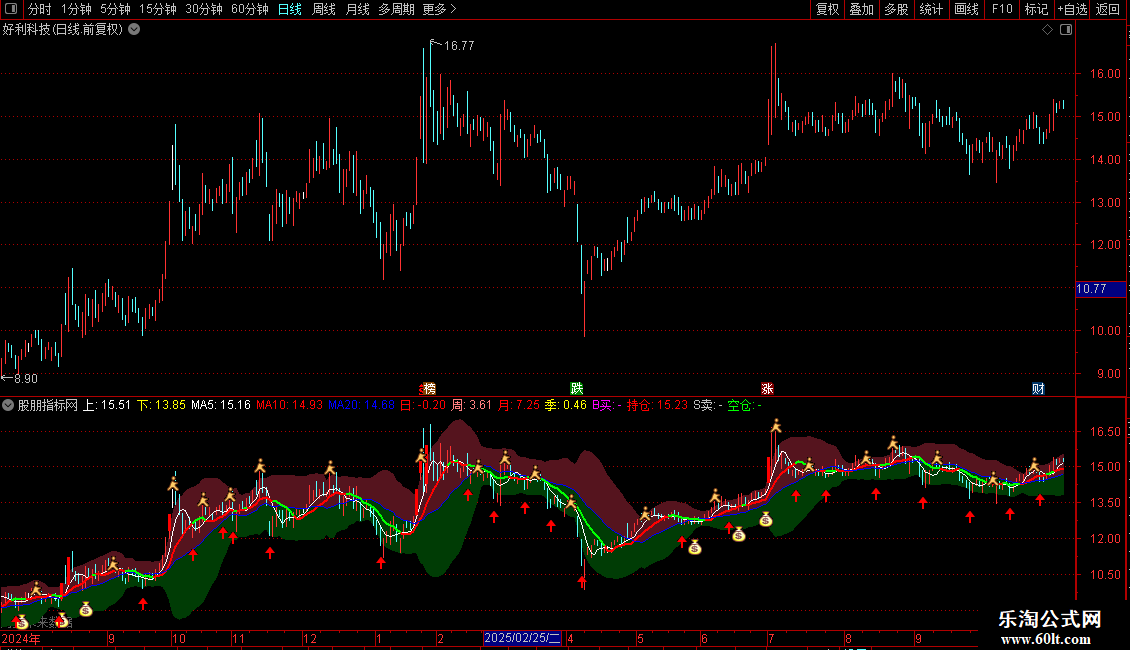 指标是一个综合性技术分析工具,融合了趋势、通道、动量与买卖信号。