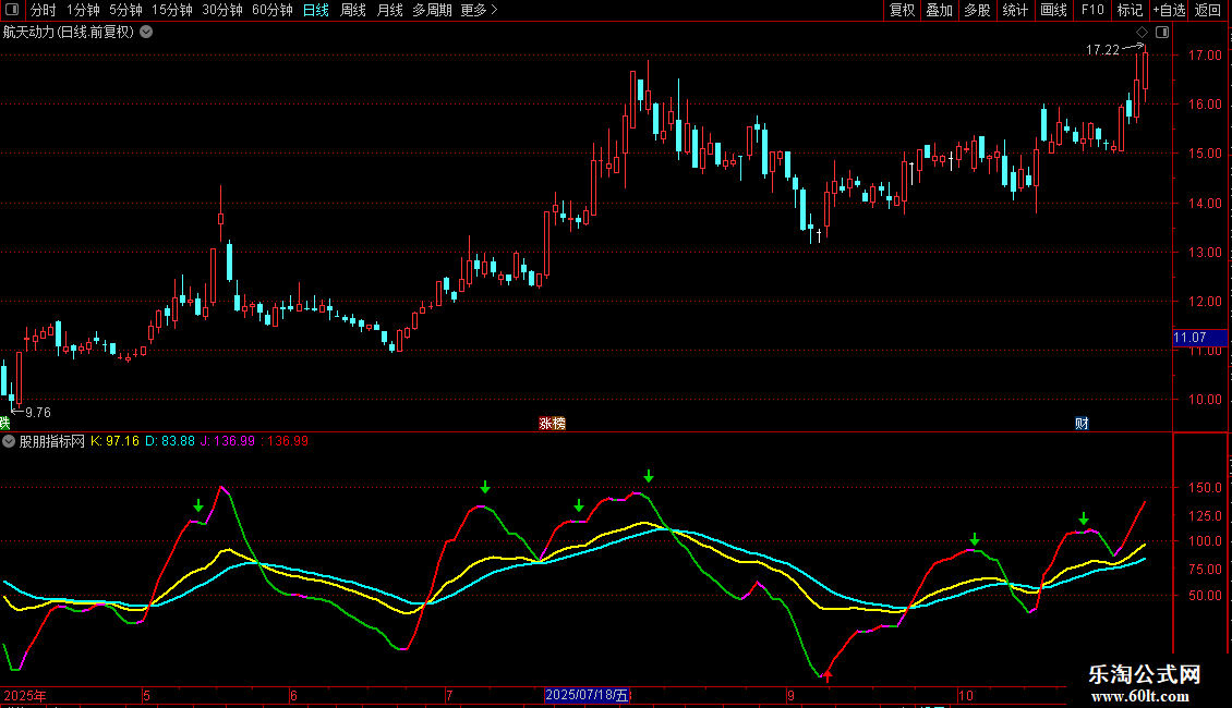 指标基于价格均值与标准差构建,通过计算K、D、J三条曲线分析价格偏离与动量变化。K线反映价格偏离均值的程度,D线为K线的平滑,J线为两者的差值。指标通过颜色区分J线涨跌,并在特定条件满足时显示买入或卖出图标。