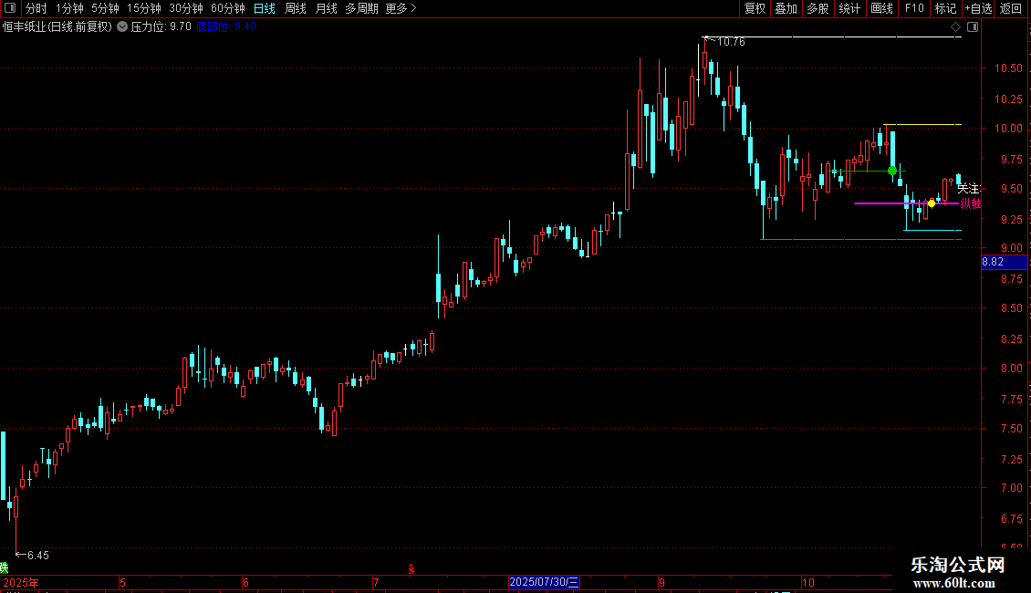 5. 关键价位标记:在自动识别出的显著高点和低点位置,用不同颜色的粗横线进行标记。