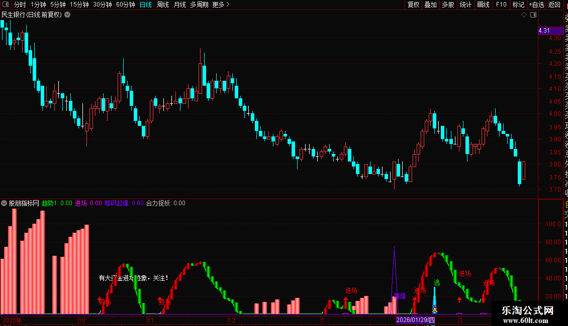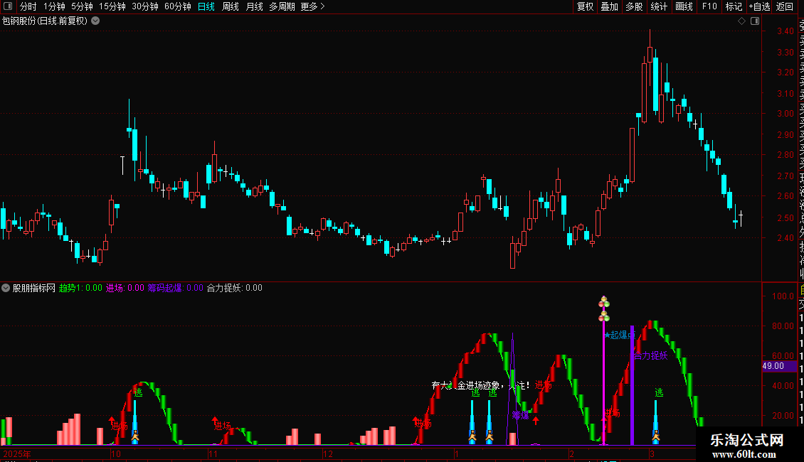 2. 进场时机:指标显示“进场”红色文字+向上箭头,且“趋势1”由绿转红时,为潜伏良机;“有大资金进场迹象”提示资金异动,需跟踪量能是否持续放大。