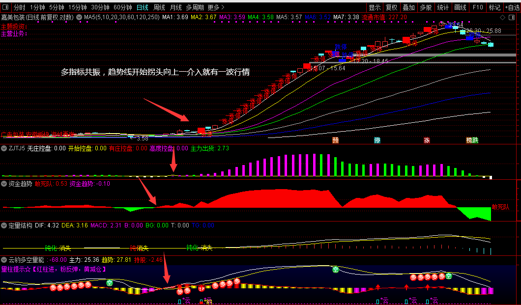 操作简单易掌握,红柱出现买入,黄柱出现逐步减持卖出,当粉柱出现可开始关注,粉柱消失出现红柱那就是一波行情的开始!配合云豹信号盘中提示信号效果更佳,主力线和趋势线拐头向上并发出红箭头提示高度关注,副图持股线提示配合红箭头发出确定上涨趋势。