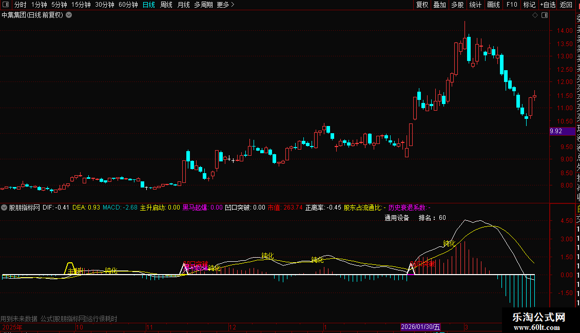 指标旨在捕捉股票主升浪的启动时机,综合了趋势、量价关系和市场情绪等多个维度。其核心策略是:首先判断股价是否有效站上长期均线(如60日线),并且短期均线呈多头排列,形成“主升启动”的基础;其次,通过计算一段时间内股价的波动幅度,寻找价格稳定、波动较小但突然放量突破的“黑马起爆”机会;最后,利用趋势指标ZIG和画线工具,识别出股价在阶段性高点后的回落低点连线(即“凹口”),当股价再次放量突破此连线时,确认为强劲的买入信号。整个系统是一个多层次的筛选器,旨在从不同角度验证庄家控盘和拉升的有效性。