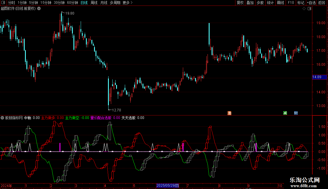 副图区域会显示“量价配合选股”和“天天选股”两个信号点。当出现彩色柱或信号点时,表示对应的选股条件被触发。