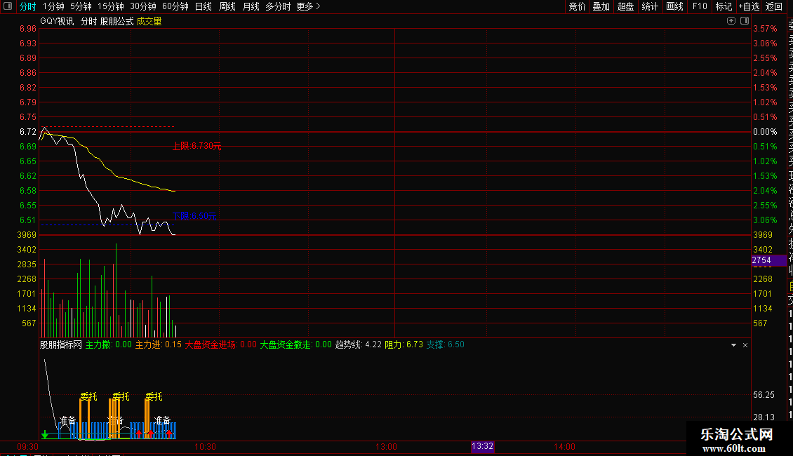 指标主要用于分时图做T交易,核心功能是监控主力与大盘资金流向,并识别超买超卖点。操作策略上:当出现“准备”或“委托”信号且趋势低位拐头时,结合支撑位买入;当显示“见顶清仓”信号或股价突破阻力位时,果断卖出止盈。同时参考主力资金红绿柱变化,顺势跟随主力进场,避开资金撤离场。
