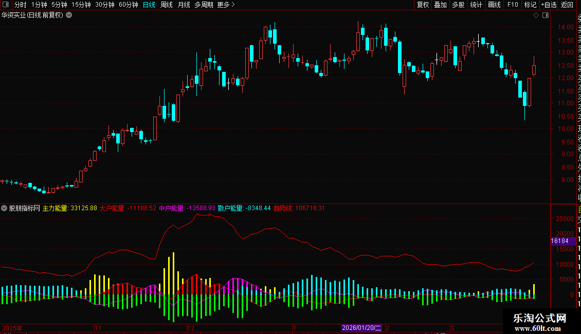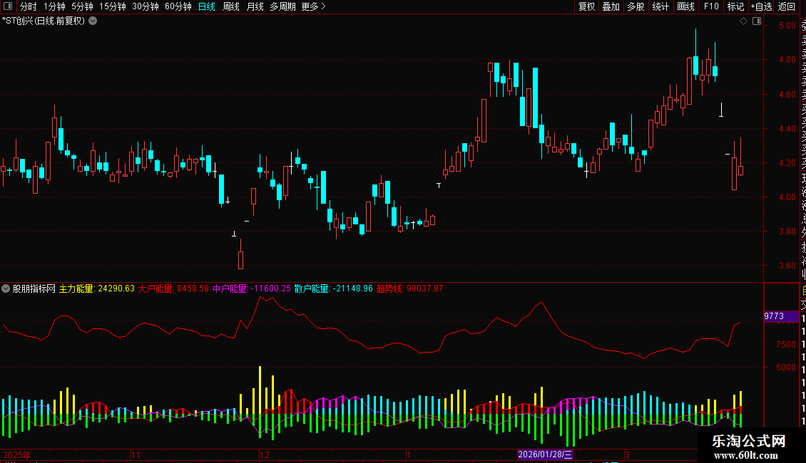 STICKLINE(大户能量>=0 AND 大户能量>=REF(大户能量,1),4,4+大户能量,1/3,0),COLORRED;