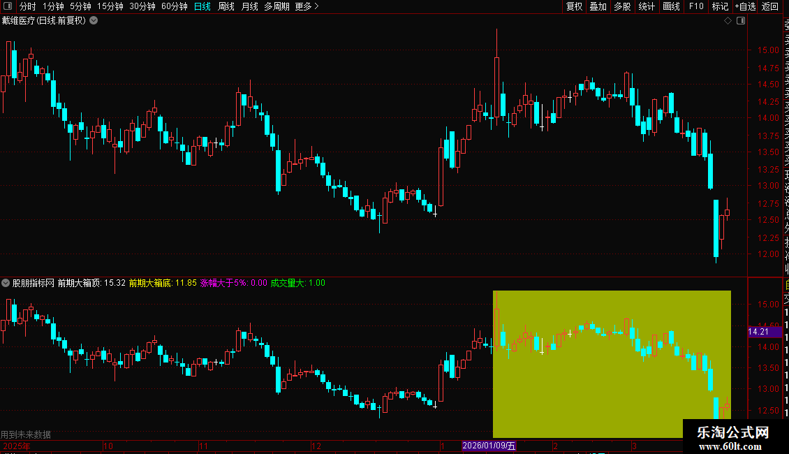 1. 绘制箱体:自动识别近期的高低点,形成一个箱体区间,并用色带标注。