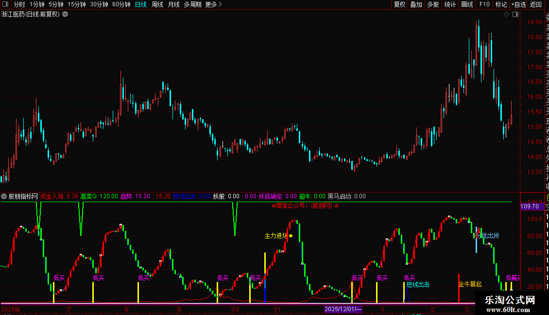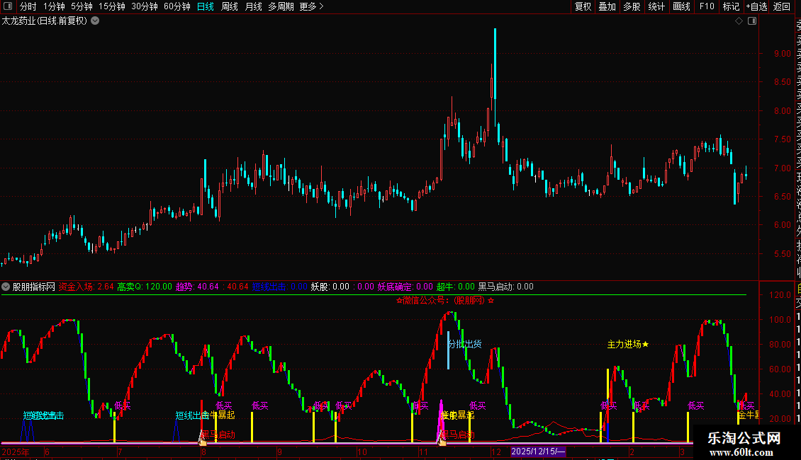 1. 副图出现“主力进场★”黄色标注,且伴随红黄蓝三色柱,代表7日内资金金叉+连续下跌后的主力进场信号,可关注低吸机会;