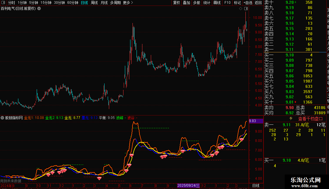 指标包含多条均线、通道线及支撑阻力线,并配有特定信号标记。