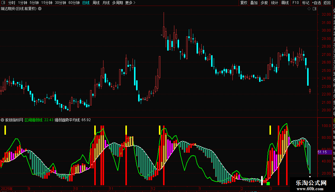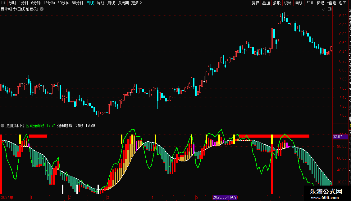2、趋势确认:通过“区间强弱线”(绿色)与“强弱趋势平均线”(白色)的交叉及颜色变化,识别趋势强弱转折点;黄色柱状线标记5日内首次出现的高点突破信号。