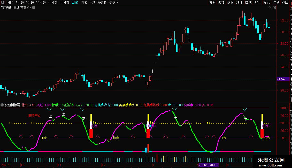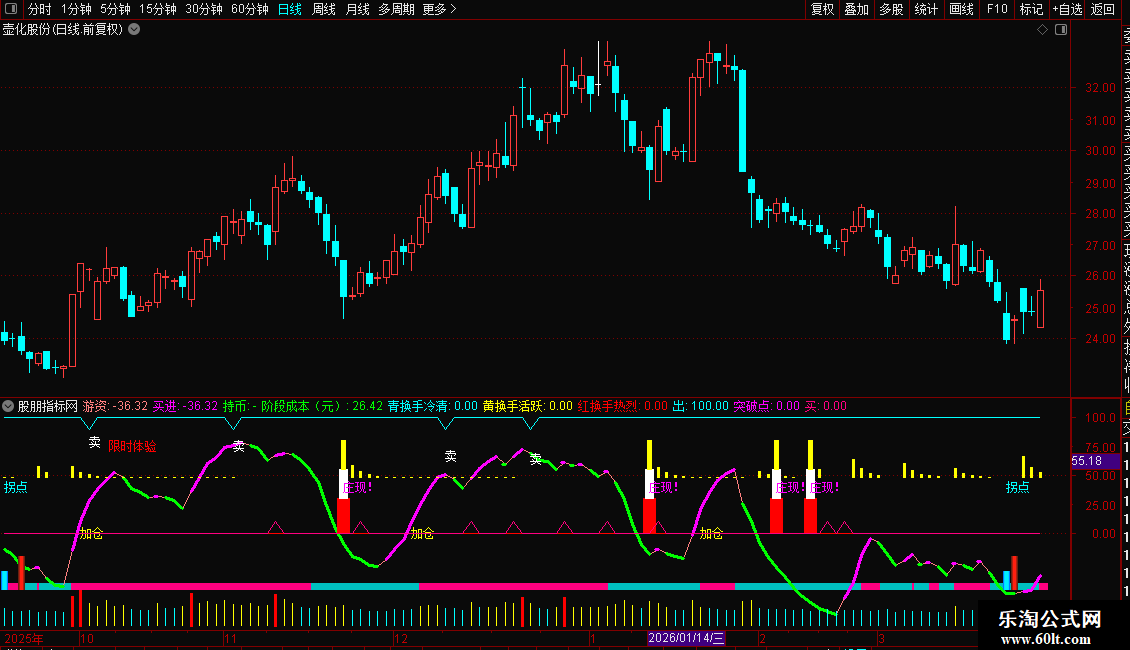 用法: 粉柱持股,蓝柱观望; 游资上扬(洋红粗线)买入,下穿(绿线)持币; “拐点”“加仓”“庄现!”提示关键机会,配合换手≥7%更有效; MM超80出“卖”字,警惕回调。
