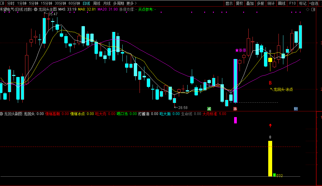 龙回头买入信号:副图出现向上红色箭头,同时显示白色数字标注断板天数,这是该指标的核心买入信号,也是短线选股的关键参考。