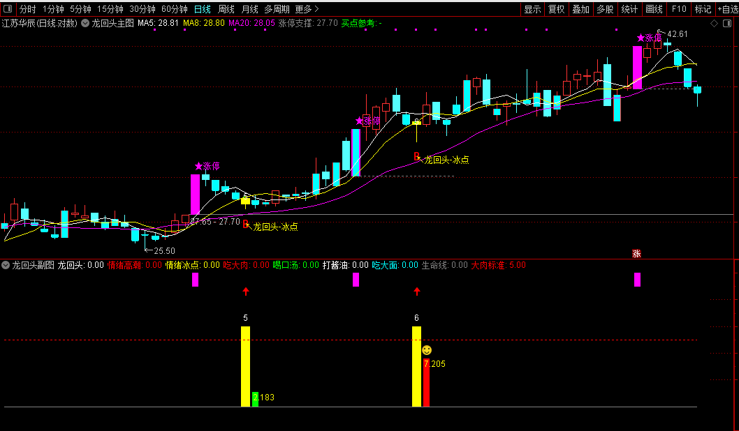 本指标为龙头股龙回头战法副图指标,属于实用股票公式指标,主要用于捕捉强势龙头股断板后的低吸买点,适配通达信软件,仅建议在日线周期使用。