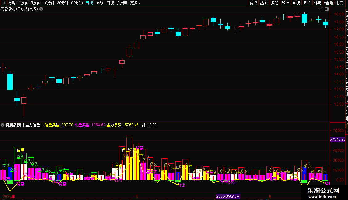 功能:指标的核心是将每日的成交量,根据开盘价、收盘价、最高价、最低价的关系,拆解为不同性质的“买盘”和“卖盘”,并用不同颜色的柱状图直观展示。同时,它还会在图上标注“倍量”、“涨停”、“背离”、“多头”等关键市场状态,帮助快速识别盘面特征。