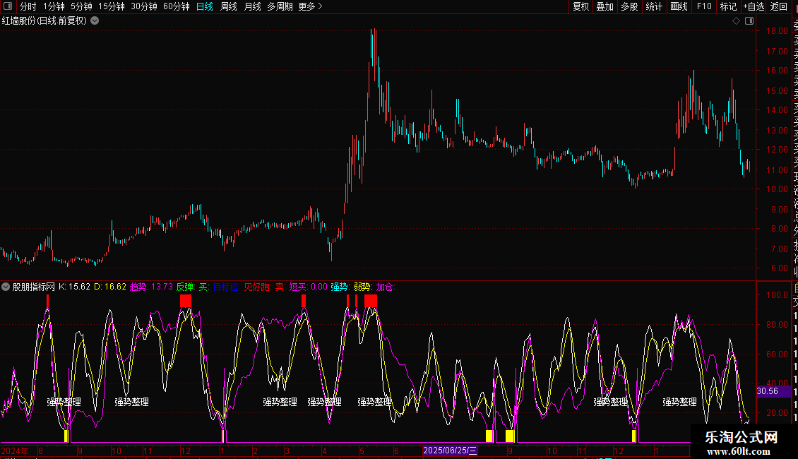 4. 辅助分析:包含类似KDJ的K、D线,以及“强势整理”等状态提示,用于辅助验证其他信号。