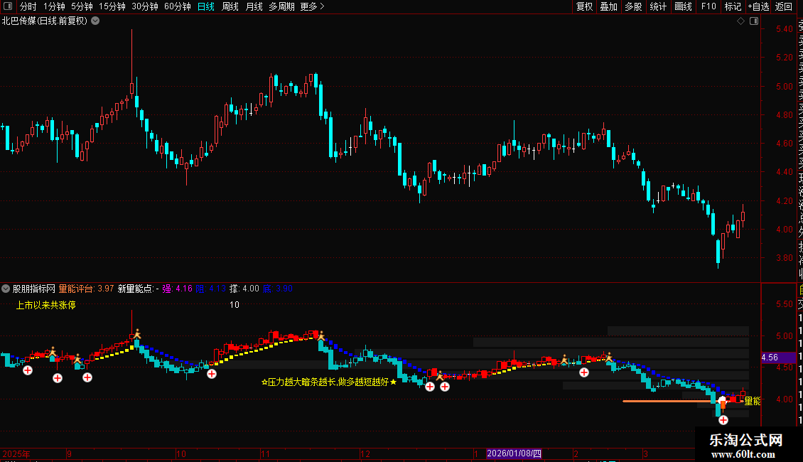 使用要点:指标综合了成交量分布、趋势方向、多空动能和关键价位,适用于分析个股的支撑阻力强度、短期多空态势以及异动点(如涨跌停)。观察时,重点关注成交量压力带的长度变化、量能平台与价格的互动关系,以及K线着色与多空区域的一致性。