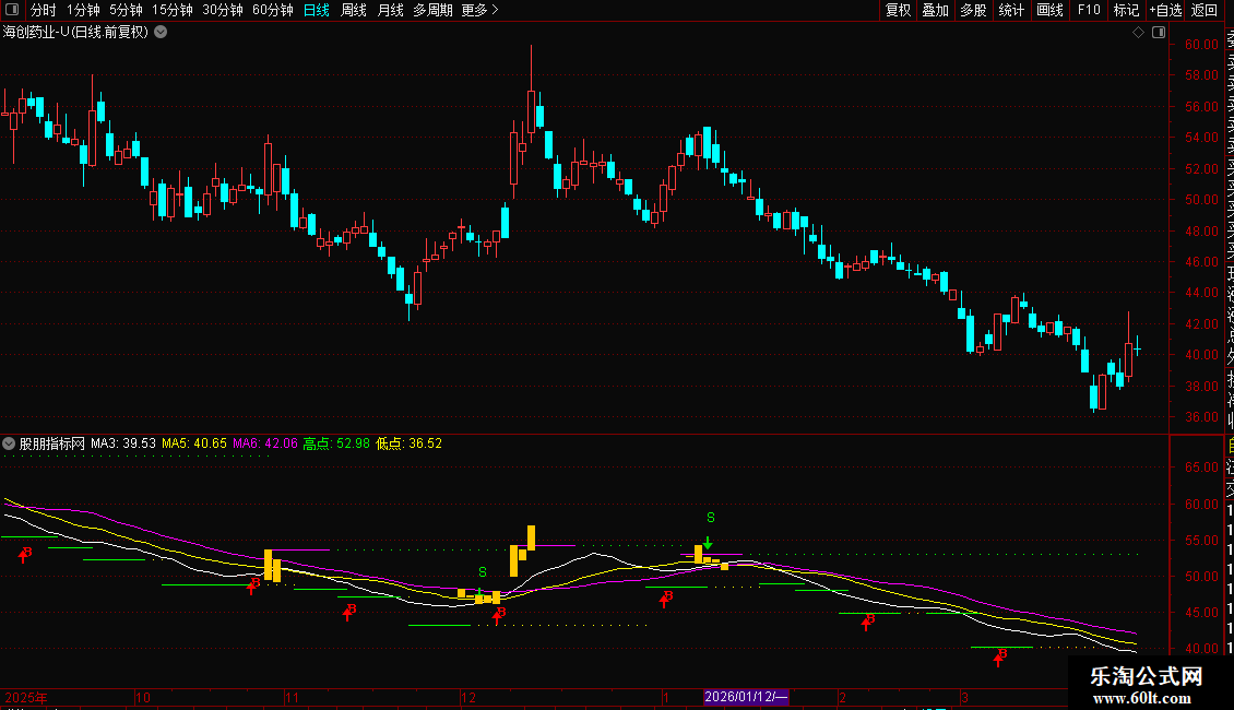 3. 卖出信号 (S):结合两种逻辑触发:一是“多头力量”显著强于“空头力量”且随机指标(KD)死叉;二是短期均线(3日)见顶回落且K值处于高位。在K线上方用绿色“S”字和图标标记。