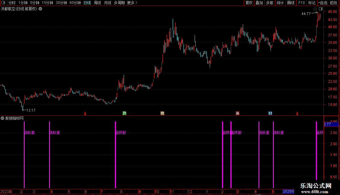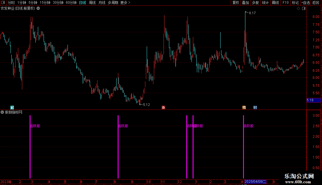 当K线下方出现洋红色柱状线及“活跃股”文字时,表示指标发出信号。