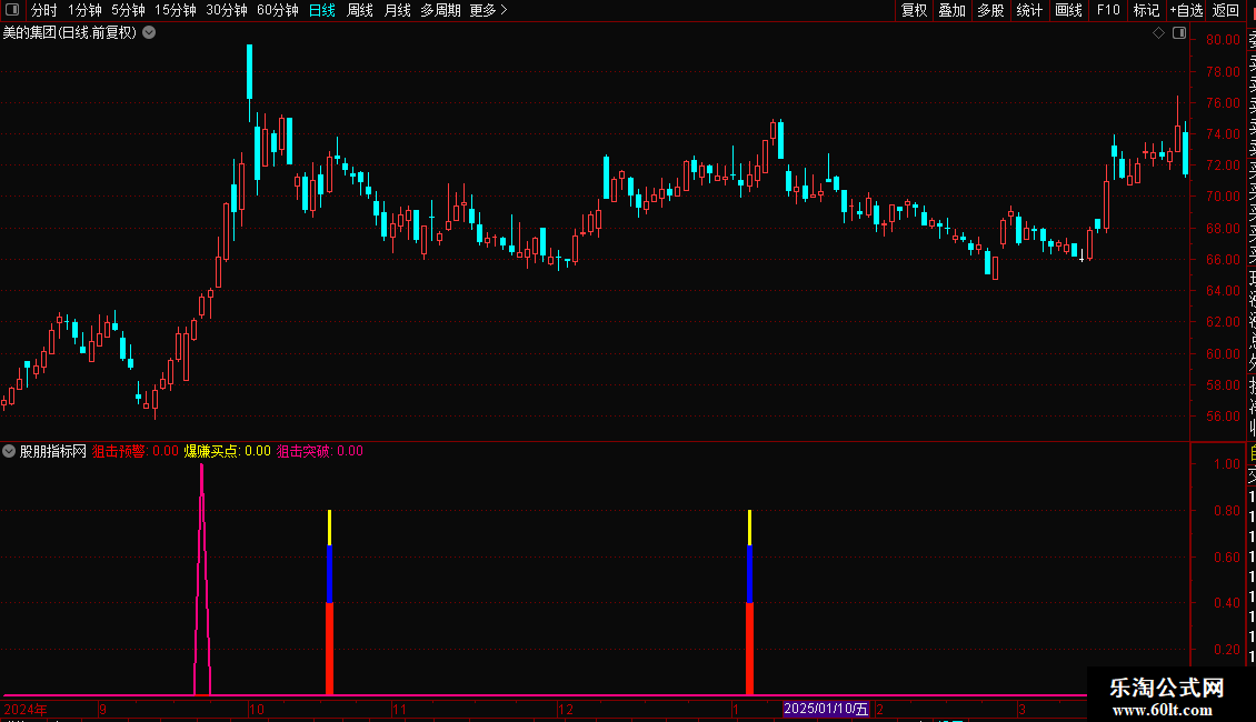稳健买点:当副图中出现由蓝、黄等颜色组成的柱状线时,提示“爆赚买点”。这通常代表个股满足多重底部启动条件,是一个相对稳健的介入时机。