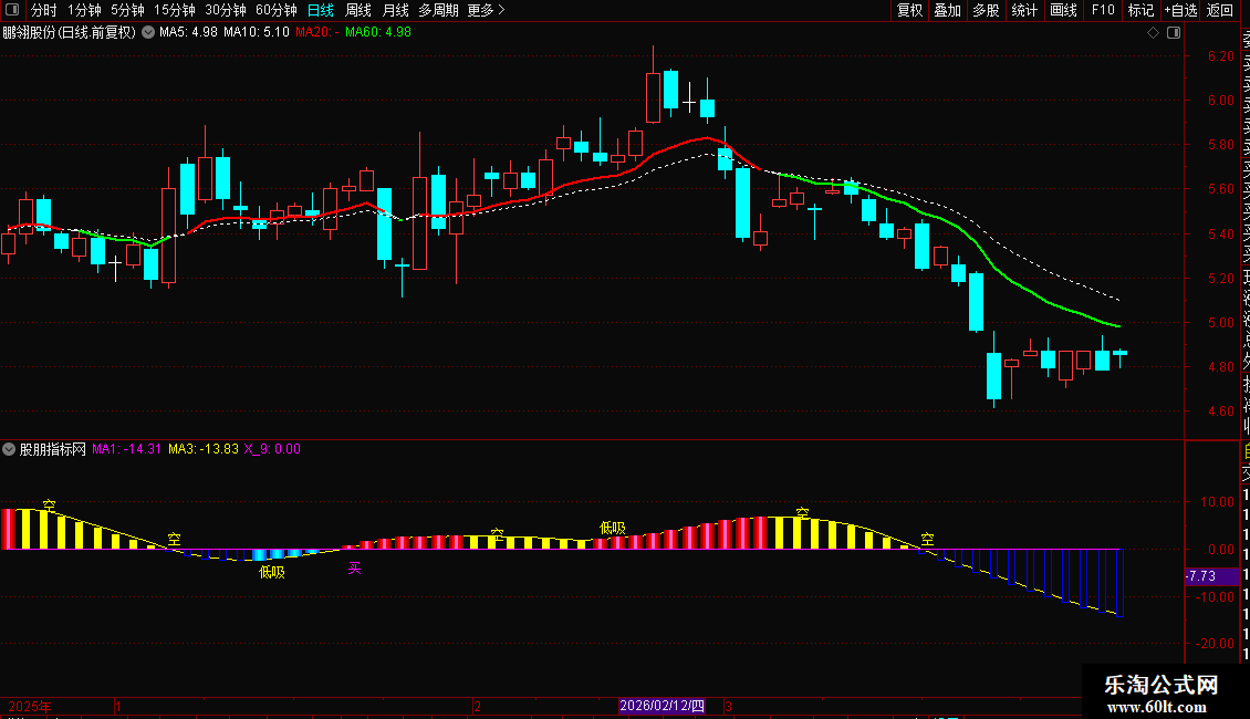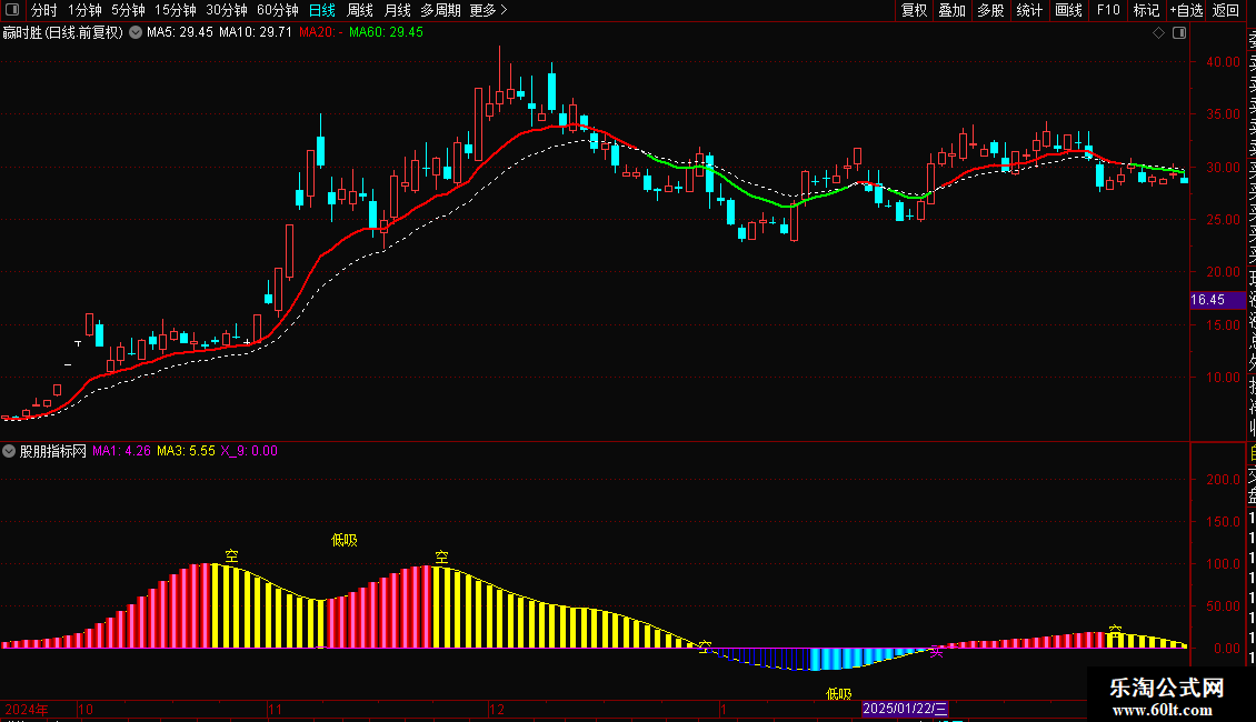 副图通过“主力动向”与MA1/MA3交叉信号,识别主力动向及“低吸”“买”时机,搭配RSI超买预警。