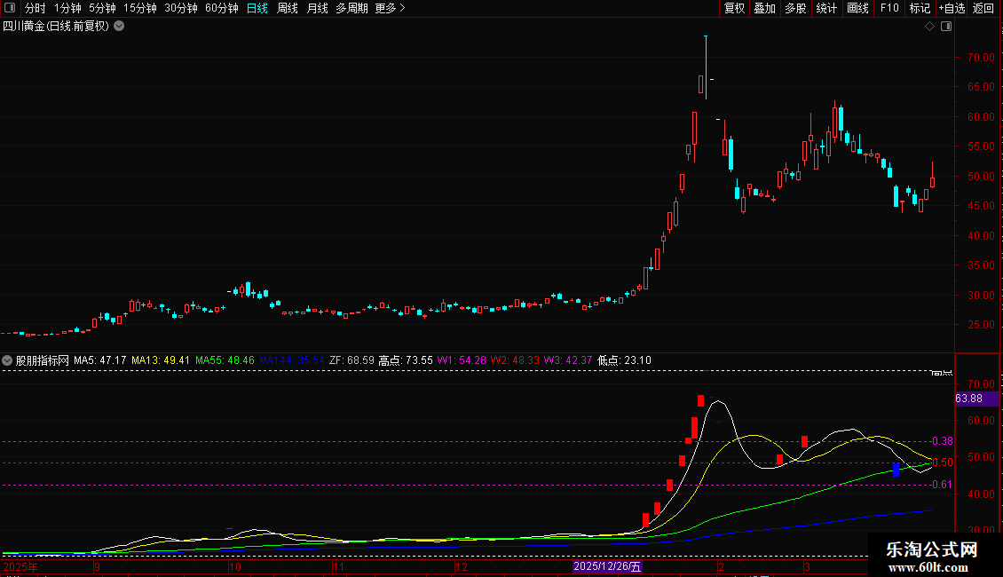 指标结合了均线系统、价格通道与黄金分割位分析,并标记涨跌停K线。