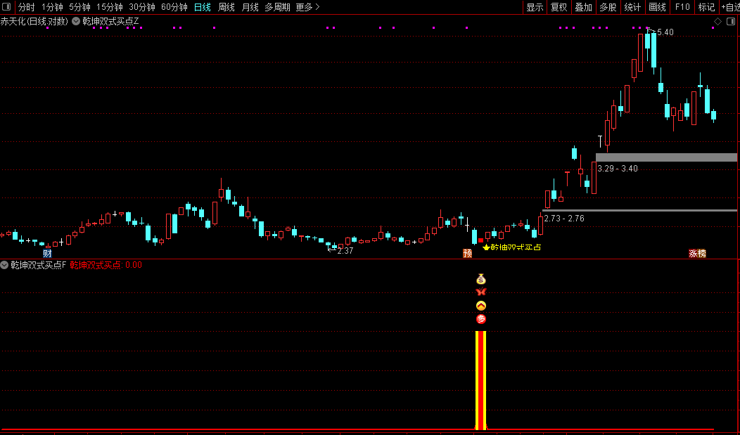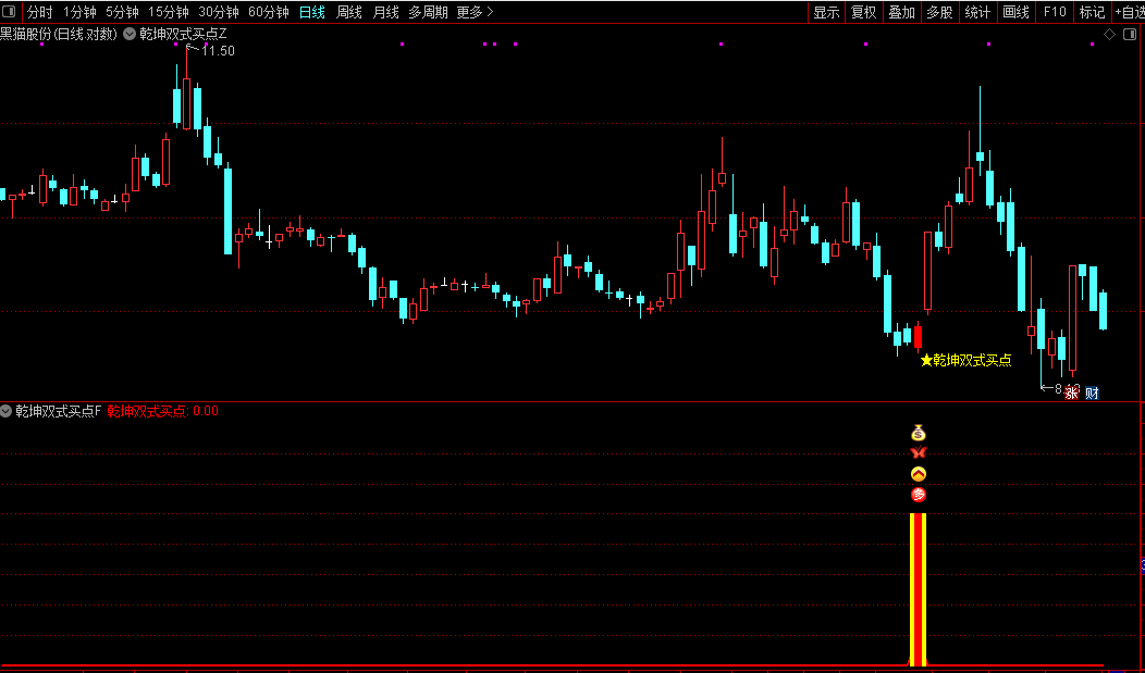 乾坤双式买点指标由1个主图、1个副图与1个选股指标构成,基于超跌反弹与强势回调的量化逻辑构建,不含未来函数,适配手机及电脑端通达信软件,信号仅供辅助参考。